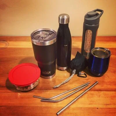 Reusable coffee things, water things, the little blue one can be used for coffee, tea or wine, straws and bag. I even put my lunch out there.