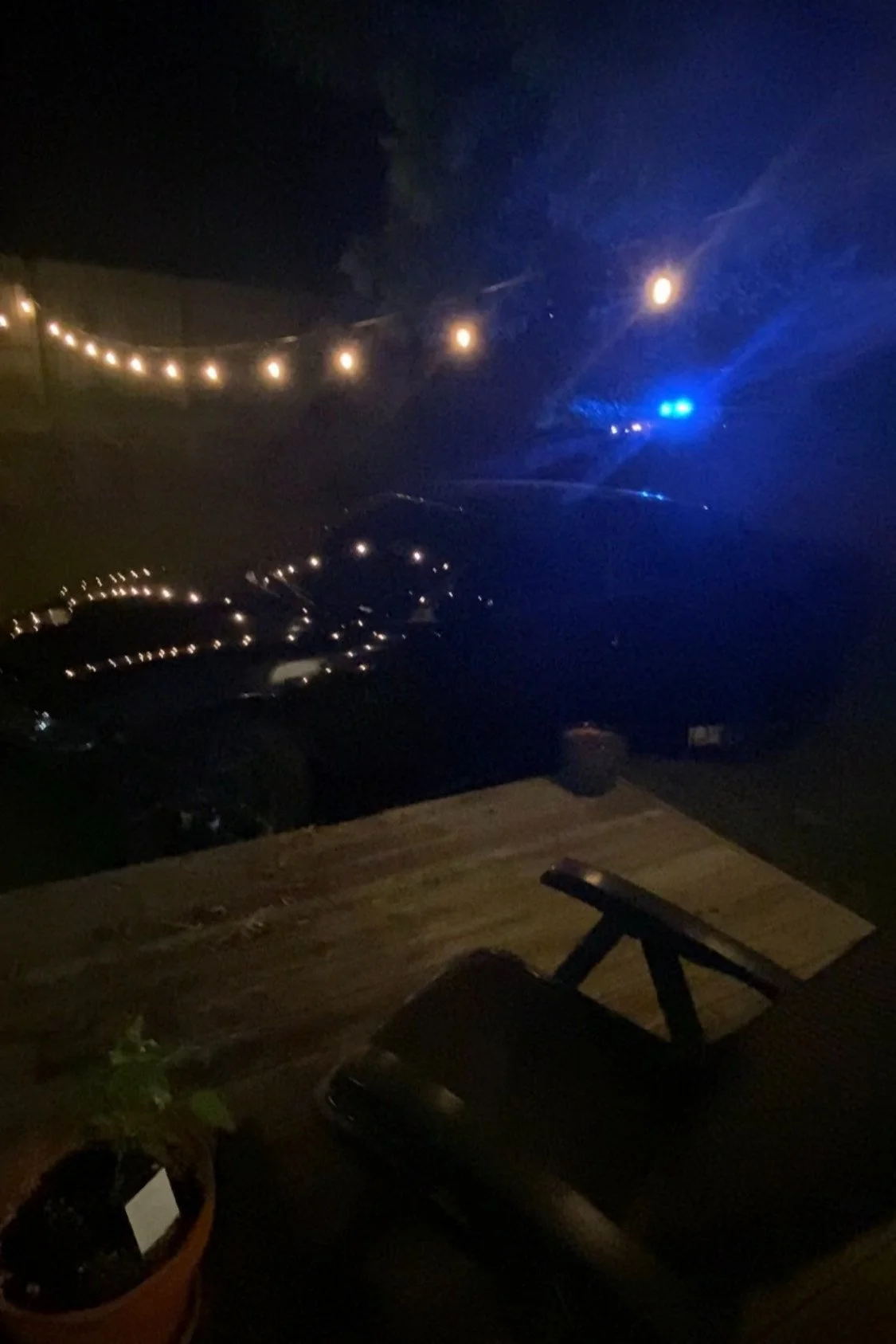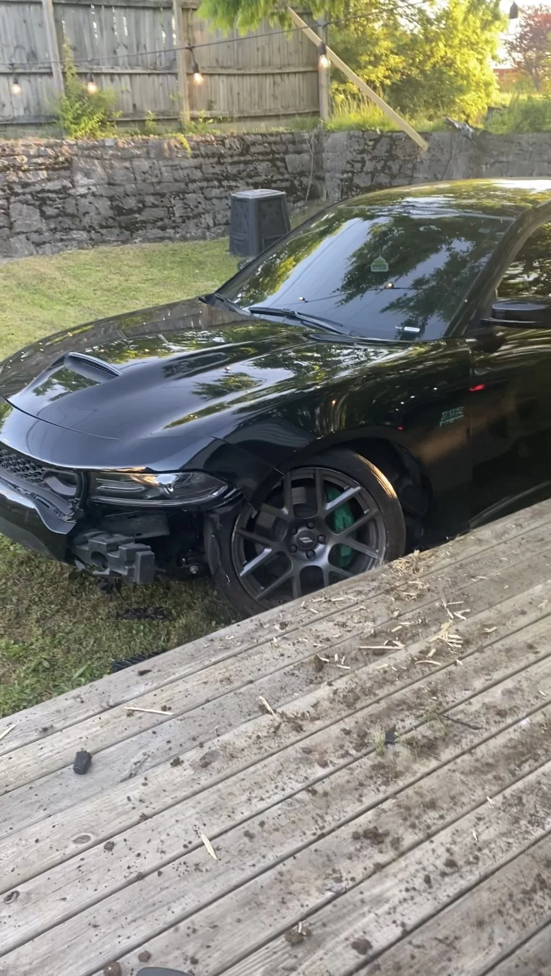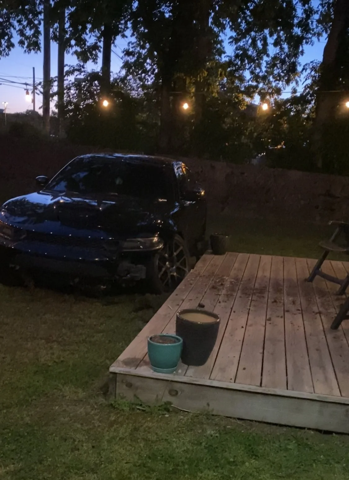 The reporting officer asked if I could see any damage, other than the obvious damage to the lawn. I said, surprisingly… no. The car had gouged out some wood on the edge of our deck, but amazingly, threaded the needle between the back fence, support beam, trees, compost, Edison light string, etc. Even our flower pots were undisturbed. They ran the temporary plates and saw that it wasn’t stolen.
